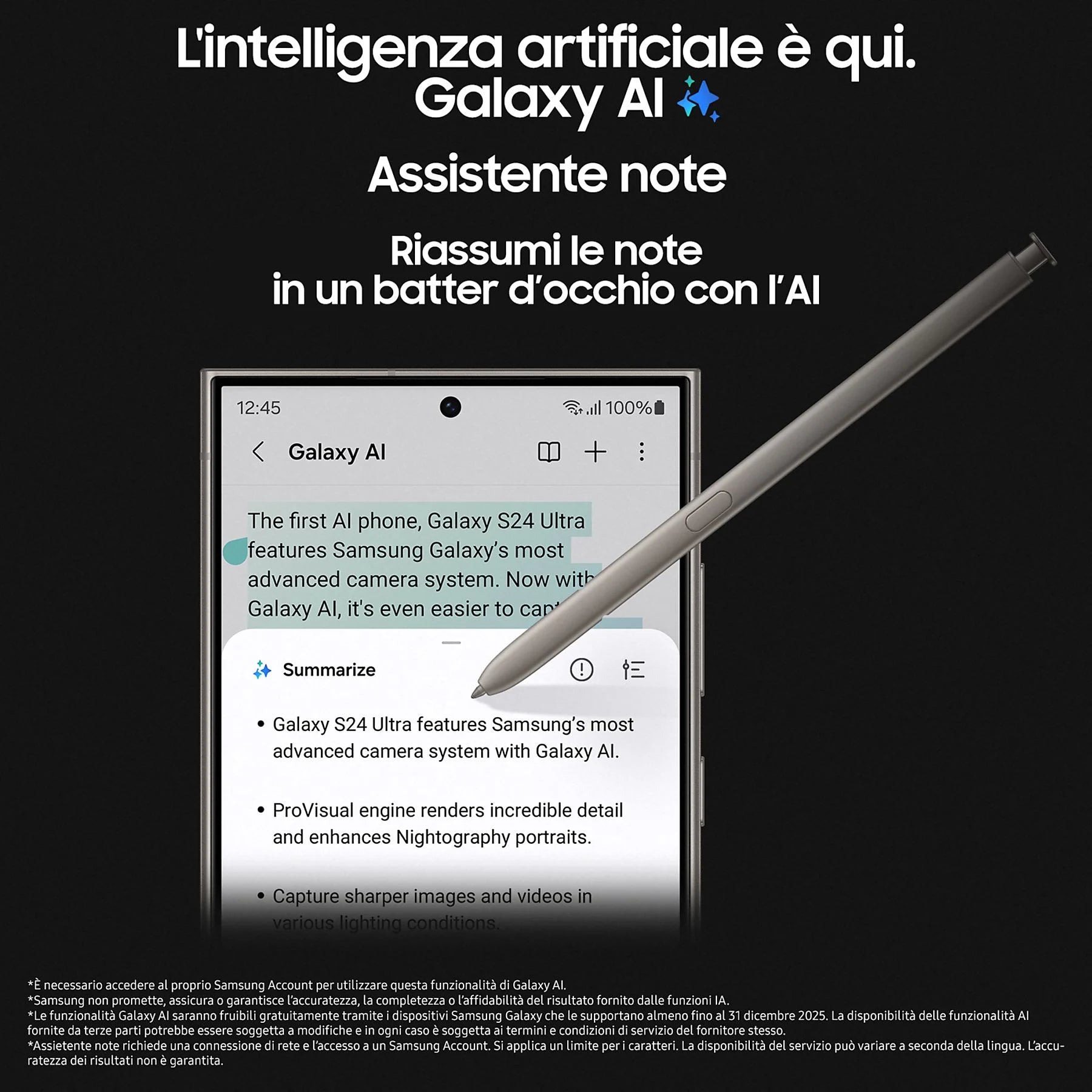 Prova un’esperienza di ricerca online mai vista prima con Cerchia e cerca, ottieni una traduzione in tempo reale di una chiamata, riassumi i tuoi appunti e riorganizzali in modo chiaro e modifica le tue foto da professionista- tutto con l'AI. Realizzato con un robusto telaio in titanio e Corning® Gorilla® Armour resistente ai graffi e grado di protezione IP68, Galaxy S24 Ultra è pronto per qualsiasi avventura. Con S Pen, scrivi, tocca e naviga sul nuovo schermo piatto con la precisione che hai sempre desiderato. Goditi la chiarezza visiva sul nuovo display QHD+ con luminosità fino a 2600 nit, anche alla luce diretta del sole grazie a Corning® Gorilla® Armor che riduce i riflessi. La fotocamera grandangolare da 200MP ti permette di immortalare momenti epici con dettagli realistici, in qualsiasi condizione di luce. Immergiti in ogni gioco con una potenza di elaborazione più veloce e una camera di vapore più grande, per un’esperienza incredibilmente fluida. Non è tutto. Grazie a un’enorme capacità e a una straordinaria efficienza energetica, la batteria di Galaxy S24 Ultra ti offre una lunga autonomia, per non abbandonarti quando ti serve